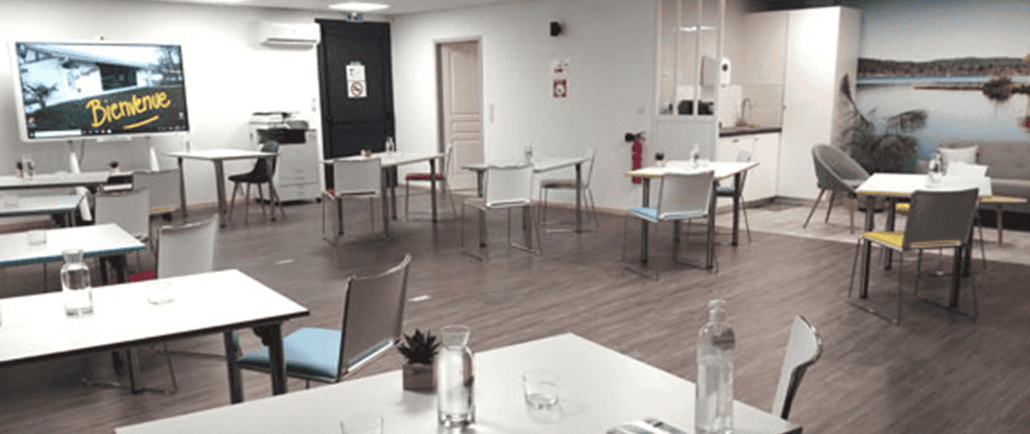La salle La Hugotière est climatisée et bénéfice d’une lumière naturelle qu’il est possible d’occulter. Jusqu’à 80 personnes peuvent être accueillies dans cet espace équipé d’un écran interactif, tactile et mobile, d’un paperboard, d’un photocopieur multifonction et d’un accès Wi-Fi. Vous y trouverez également un salon de détente afin de pouvoir y déguster nos pauses gourmandes avec des boissons si vous le souhaitez. Accès PMR.